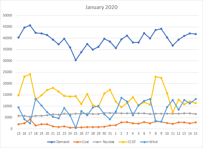 The day of greatest demand at 7pm was 17th December when 45.7GW were required. Wind contributed 5.35%, gas 52.98% and coal generators were in use to provide 9.43%.